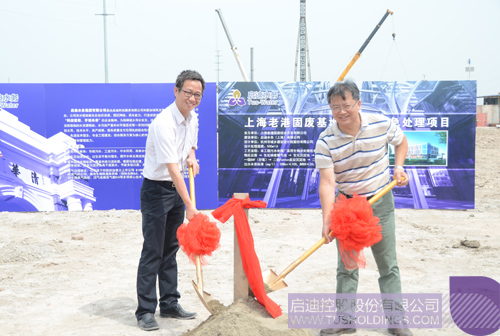 啟迪水務(wù)集團(tuán)總經(jīng)理俞建中(左)和杭州院總工趙宏共同揮鍬為項(xiàng)目奠基