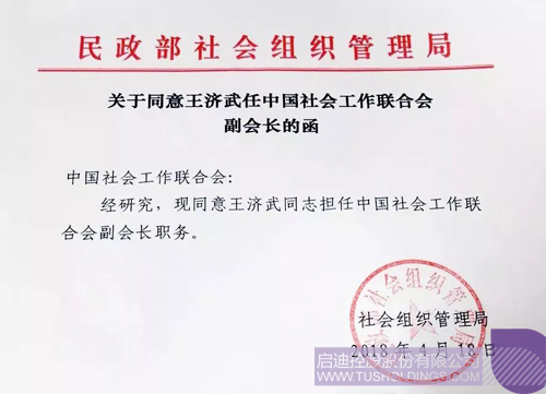 2018年4月,民政部社會組織管理局復函中國社會工作聯合會,同意王濟武同志擔任中國社會工作聯合會副會長職務。此任命經中國社會工作聯合會宮蒲光會長提名,中國社會工作聯合會黨委會決定。