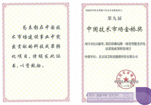 2018年10月,第九屆中國技術市場協會金橋獎頒獎大會在北京舉行,啟迪清蕓 “監控診斷運維一體化智能光伏電站系統”(SOLARULE系統)斬獲中國技術市場金橋獎項目突出貢獻獎,并在同類獎項中名列第一。