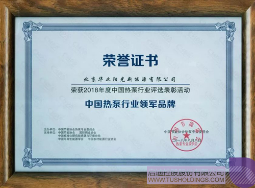 2018年8月,在由中國節能協會主辦、中國熱泵產業聯盟承辦的2018中國熱泵行業年會暨第七屆國際空氣源熱泵行業發展論壇上,華業陽光以優異的成績及表現榮獲空氣源熱泵行業最高榮譽—“中國熱泵行業領軍品牌”稱號。