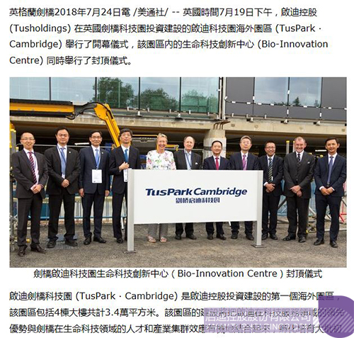 近日,由啟迪控股在英國劍橋投資建設的劍橋啟迪科技園(TusPark?Cambridge)舉辦開幕儀式和園區生命科技創新中心(Bio-InnovationCentre)封頂儀式,該活動在全球范圍內引起廣泛關注,位于美國、法國、意大利、德國、英國、加拿大、瑞士、葡萄牙、俄羅斯、日本、新加坡、韓國、澳大利亞、印度、泰國、印度尼西亞、馬來西亞等國家和中國香港、澳門、臺灣地區的共計數百家媒體對此進行了不同形式的報道。
